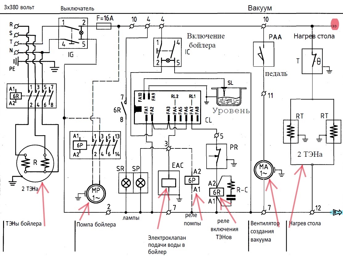 Когда включаем выключатель IG на панели стола. Питание 220 вольт подается через предохранитель 16 А на всю схему машины клеммы 10 и 4. Она готова к выполнению команд в зависимости какой выключатель в дальнейшим будет включен. При включении Выключателя "Включение бойлера IC" питание подается с контакта 1 на контакт 2 и уже с него на питание реле уровня FA2/ FA4/FA6. Нейтраль соединена постоянно с клеммой FA1. Датчик уровня SL не касается воды и цепь контроля не замкнута на корпус бойлера через воду. Поэтому реле сначала включит контакты реле помпы и клапана налива воды. По мере заполнения водой сработает датчик SL. И реле контроля отключит налив воды и включит нагрев бойлера реле "6R". Когда давление пара достигнет установленного предела установленного в реле давления "PR" то нагрев прекратитсяи по мере расхода пара или остывания самого бойлера когда давление упадет до заданного предела по минимуму реле давления заново его включит. Со временем происходит выкипание воды в котле бойлера. И электрод уровня размыкается относительно корпуса котла и тогда опять включается подача воды в бойлер через помпу и клапан налива воды. Этот цикл повторяется постоянно.