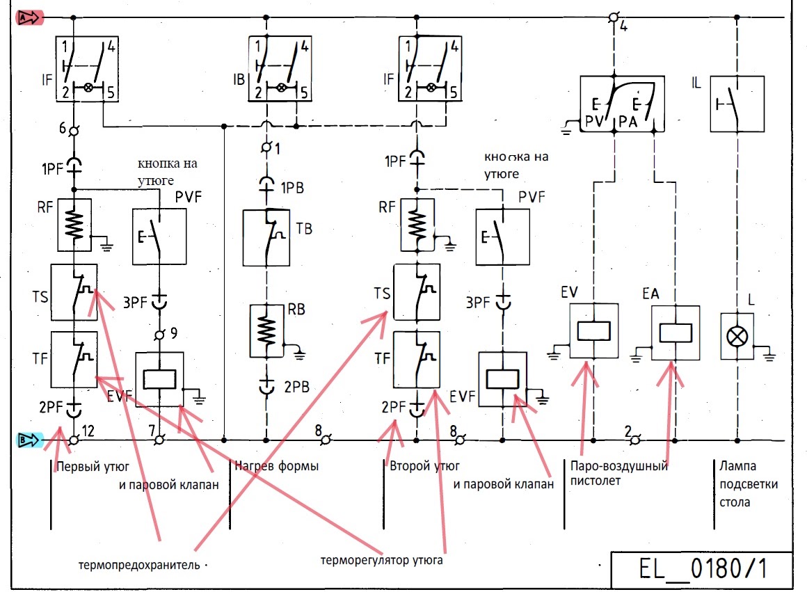 Теперь считаем что пар в системе есть. Включаем kgvgeосвещения стола выключатель "IL". Выключателем "IF" включаем нагрев первого утюга. Нагревательный элемент "RF" разогревает подошву утюга. Регулятор температуры "TF" отключает нагрев при заданной температуре (к примеру 180 градусов и по мере остывания опять его включает). Температурный датчик "TS" является термопредохранителем на 250 градусов если по какой то причине утюг не отключился то он перегорает и отключается нагрев и утюг нельзя включить на нагрев пока его не заменят и за одно выяснят причину срабатывания по перегреву. "PVF" - это кнопка на ручке утюга через которую подается команда подать пар. "IB" - функция подогрева поверхности стола, а регулятор "ТВ" это заданная температура нагрева.